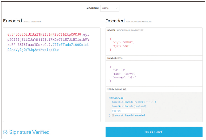 - 헤더 : 토큰 종류와 해시 알고리즘 정보가 들어있다.