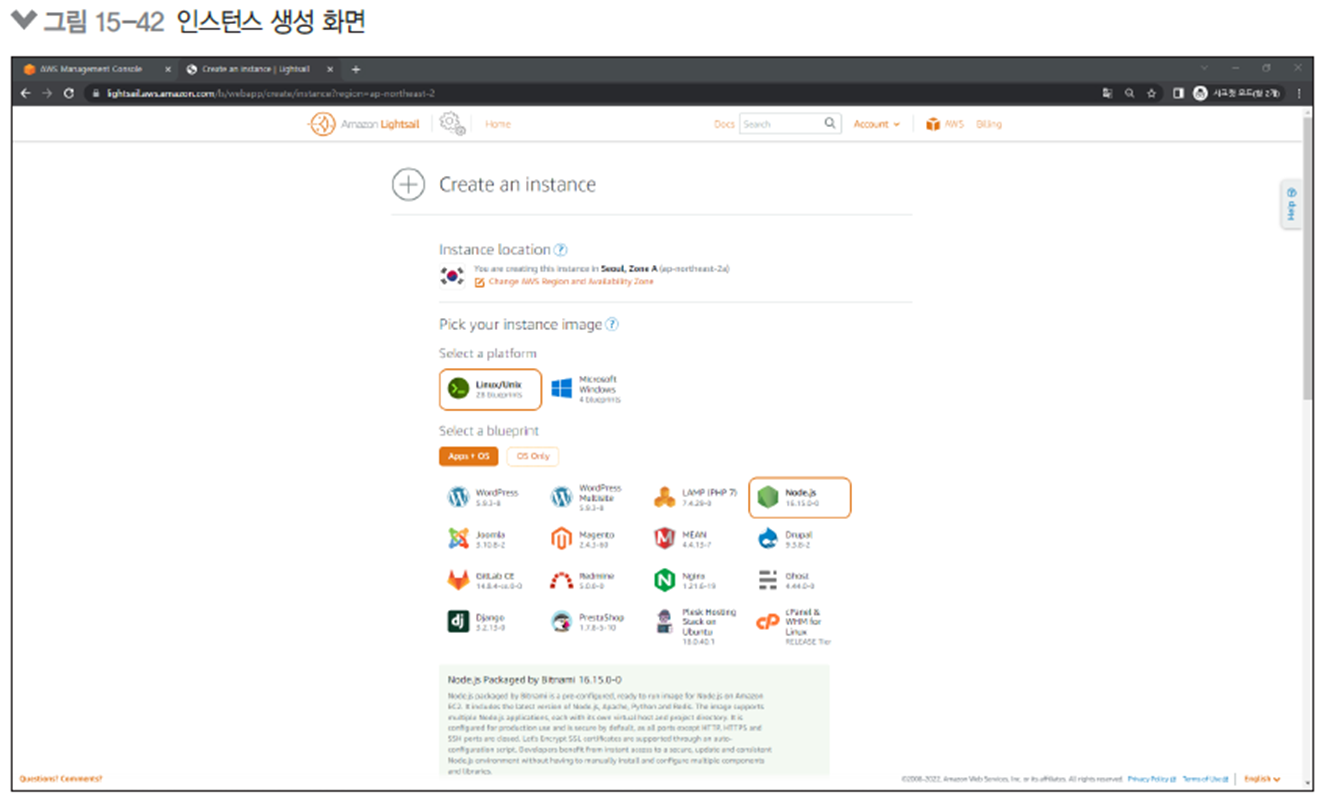 ⇒ 인스턴스의 시작지점은 한국과 가까울수록 이점이 많다. Linux와 Node.js를 선택한다.