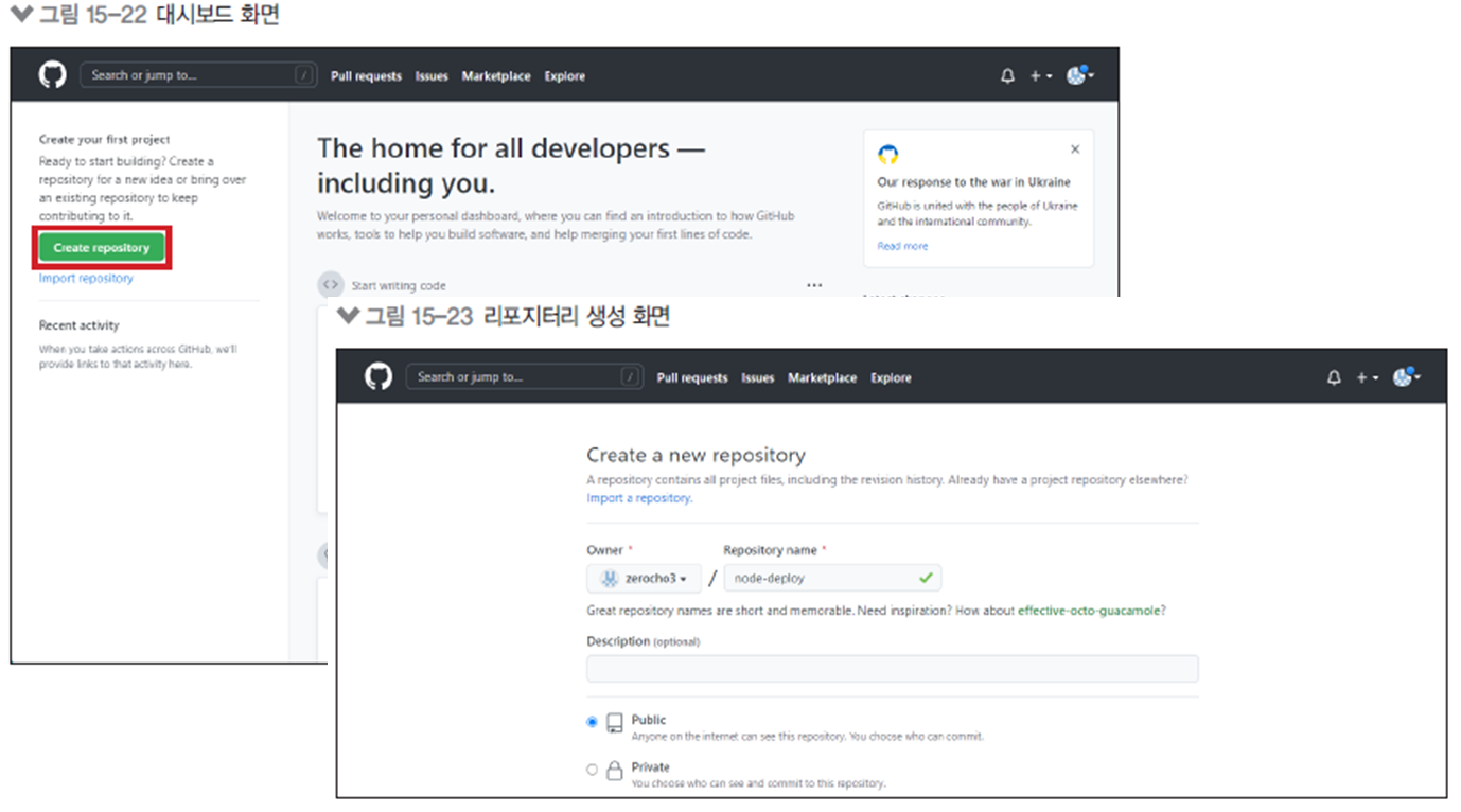 - 리포지터리 이름은 node-deploy로 하고 Create repository 버튼을 클릭한다.