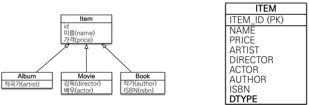 @Inheritance(strategy=InheritanceType.XXX) - JOINED : 조인 전략 - SINGLE_TABLE : 단일 테이블 전략 - TABLE_PER_CLASS : 구현 클래스마다 테이블 전략 (실무 미사용)