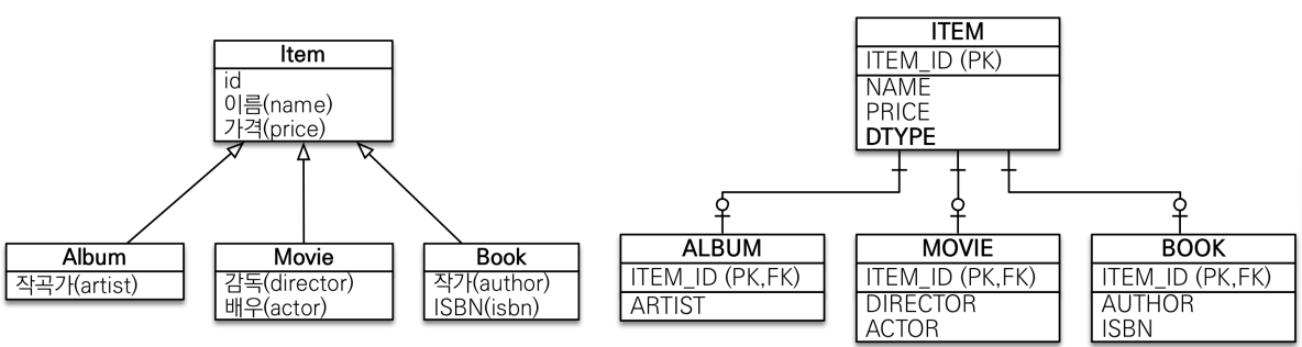 슈퍼타입 서브타입 논리 모델을 실제 물리 모델로 구현하는 방법 - 각각 테이블로 변환 → 조인 전략 - 통합 테이블로 변환 → 단일 테이블 전략 - 서브타입 테이블로 변환 → 구현 클래스마다 테이블 전략 (구조적 결함이 커 실무에서 미사용)