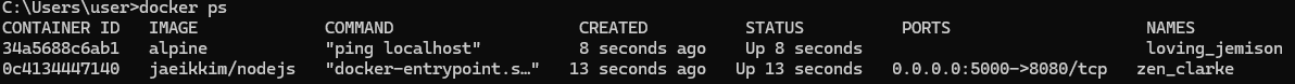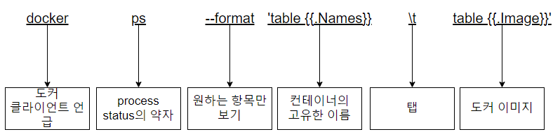 - NAMES : 컨테이너 고유한 이름. 컨테이너 생성시 -name 옵션으로 설정 안하면 도커 엔진이 임의로 설정