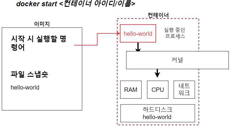 - Docker start <컨테이너 아이디> : 도커 컨테이너를 실행한다. 단 컨테이너 실행시 -a 명령어를 포함해야 한다.