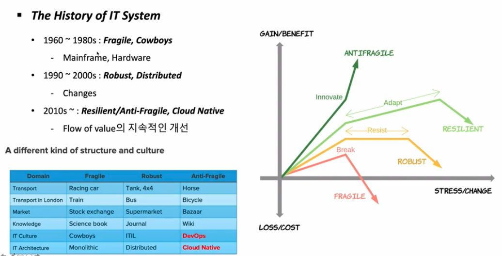 Anti-Fragile부터 DevOps라는 문화가 생겨났고, IT 아키덱처 측면에서는 Cloude Native 아키텍처로 전환되었다.