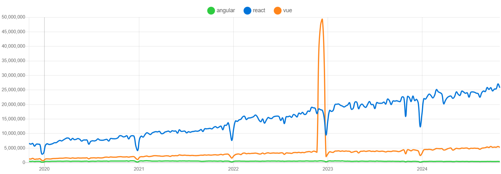 2013년에 페이스북에서 발표한 오픈소스 자바스크립트 프론트 프레임워크이다. 프론트 개발영역에 속하며 가상 DOM(document object model), JSX(Javascript XML)라는 새로운 방식으로 동작한다. 2022년도에는 vue가 일시적으로 점유율이 높은 것으로 파악 되었으나, 이는 코로나 사태의 빠른 비대면 서비스를 만들기 위해선 vue를 도입할 수 밖에 없었던 상황으로 이해된다.