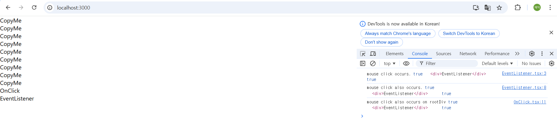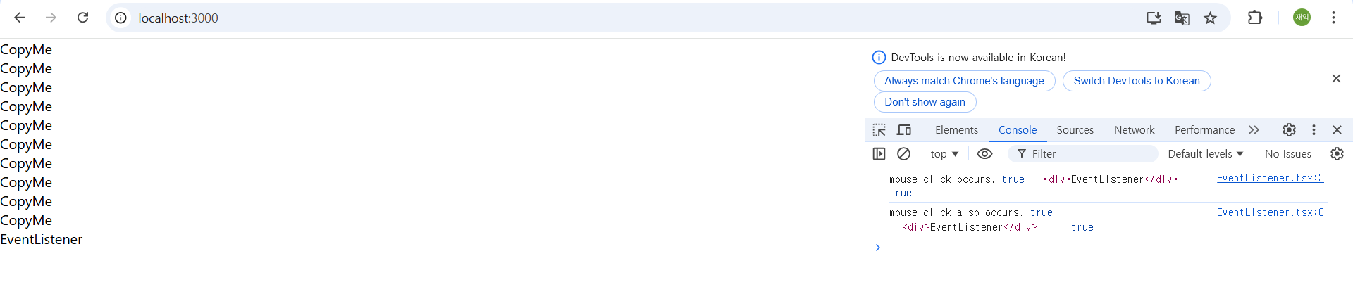 웹 브라우저에서 id가 'root'인 영역안을 마우스로 클릭할 경우 이벤트가 발생하는걸 확인할 수 있다.