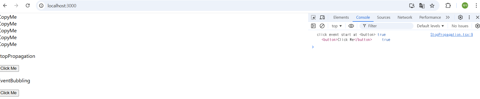 이벤트 버블링이 발생하면 이벤트가 직접 발생한 onButtonClick에서는 e.CurrentTarget값이 null이지만, 부모 요소의 onDivClick에서는 e.currentTarget값이 <div>의 DOM 객체로 설정된다.