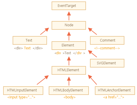 모든 HTML의 요소는 HTMLElement 상속 타입을 가지고 있다. 위의 그림과 같이 최상위 EventTarget타입을 시작으로 Node, Element와 같은 타입을 상속한다. 그러므로 모든 HTML요소는 EventTarget타입이 정의하는 속성과 메서드를 포함하고 있다.