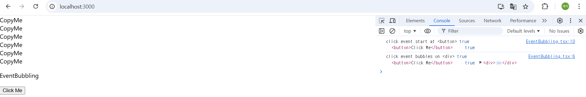 이벤트 버블링이 발생하면 이벤트가 직접 발생한 onButtonClick에서는 e.CurrentTarget값이 null이지만, 부모 요소의 onDivClick에서는 e.currentTarget값이 <div>의 DOM 객체로 설정된다.