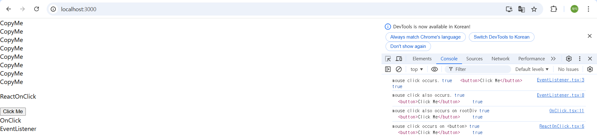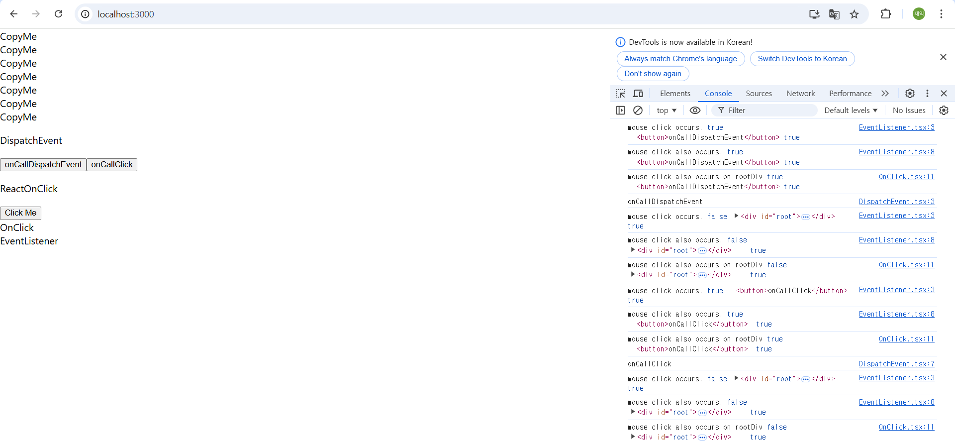 웹 브라우저에서 id가 'root'인 영역안을 마우스로 클릭할 경우 이벤트가 발생하는걸 확인할 수 있다.