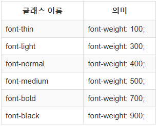 css는 글자의 굵기(weight)를 설정할 수 있는 font-weight 스타일 속성을 제공하며, 테일윈드 CSS는 이에 대응하는 클래스인 클래스를 다음과 같이 제공한다.