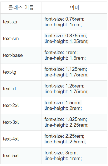 테일 윈드 CSS의 기본 글자 크기는 text-base(font-size:1rem, line-height:1.5rem) 클래스를 기준으로 한다.