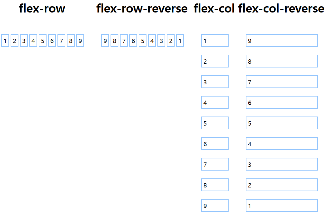 CSS에서는 flex-direction 속성을 제공하며 display 설정값이 flex일 경우에만 사용할 수 있다. flexdirection의 설정값은 row, row-reverse, column, column-reverse 등이 있으며 기본값은 row이다. 테일윈드CSS는 flex-direction 설정값에 대응하는 클래스를 제공한다.