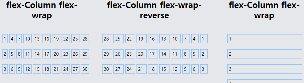 | flex-col-reverse | flex-direction: column-reverse; | 수직으로 배치하며 최신순으로 순차적 배치한다. |