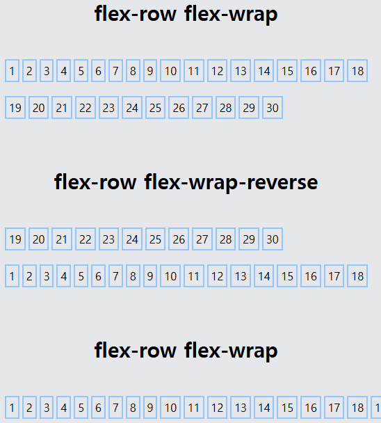 | flex-wrap-reverse | flex-wrap: wrap-reverse; | 콘텐츠를 왼쪽부터 수평배치하다 위로 줄바꿈하여 배치한다. |