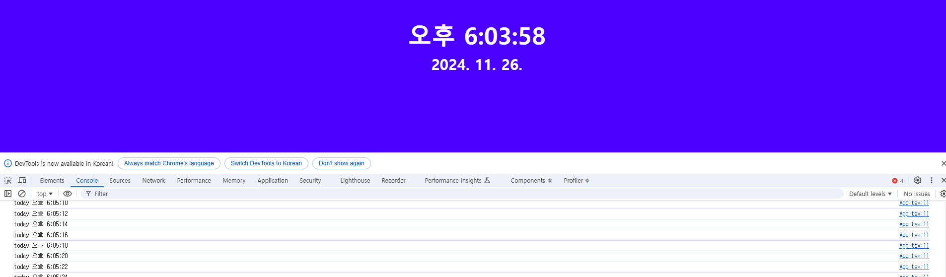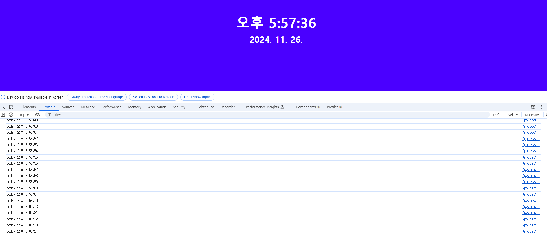 setInterval함수 내에 1초마다 setToday(new Date())를 호출해 today값을 변경하고 있다. 값이 변경되었기 때문에 useState는 컴포넌트를 자동으로 다시 렌더링하여 화면 상의 시간이 변화하는 것을 확인할 수 있다.
