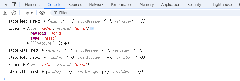미들웨어를 테스트하기 위해 dispatch를 추가해 해당 action을 수행해본다. action이 리덕스에서 처리될 경우 logger를 타는 것을 확인할 수 있다.